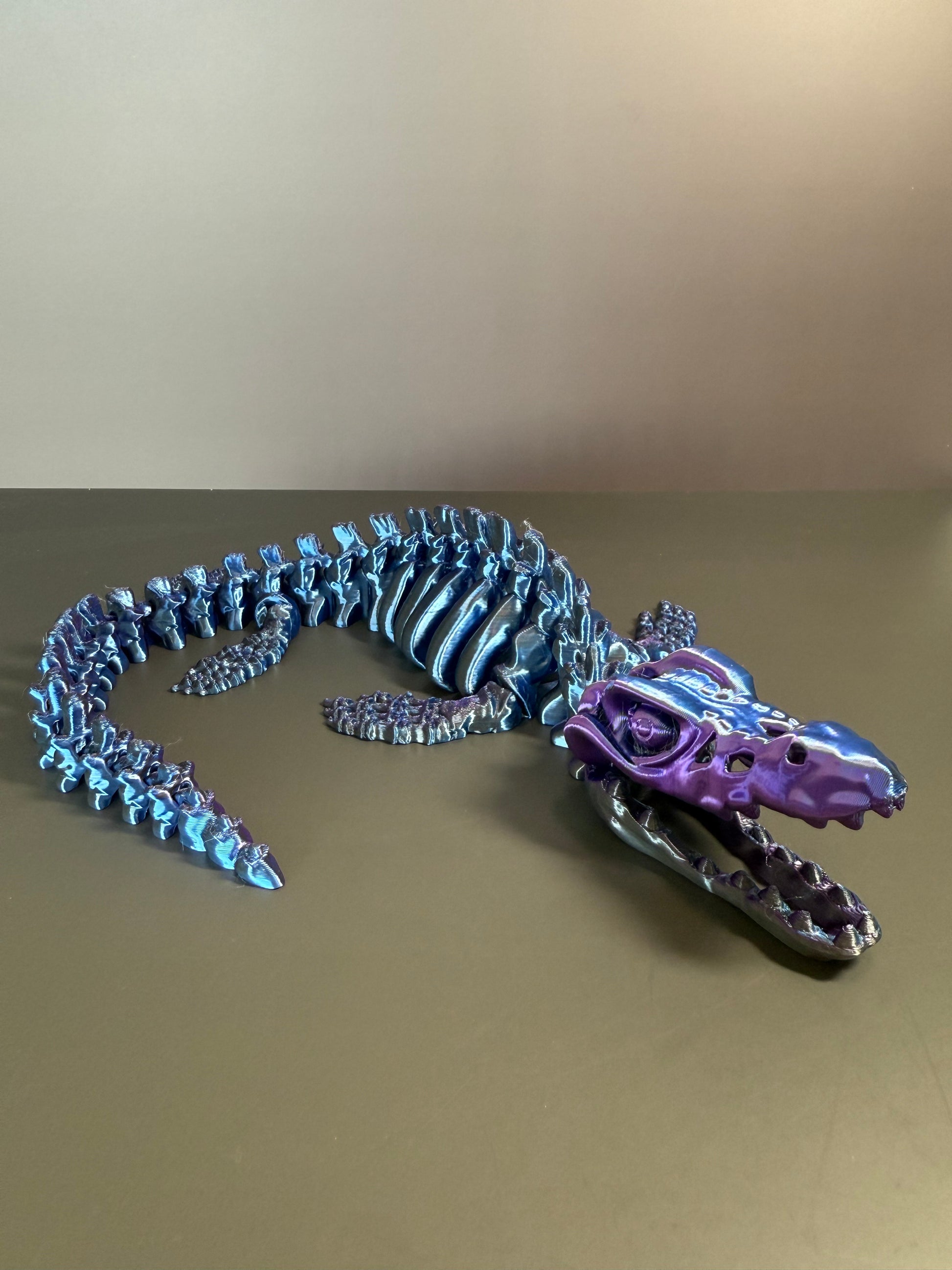 Rule the ancient seas with this stunning articulated Mosasaurus skeleton — a deep-sea legend brought back to life through precision 3D printing. Each segment of this ocean-dwelling titan flexes smoothly, showing off its long, fluid body and powerful jaws. The shimmering metallic finish captures the light like rippling water, making it an incredible showpiece for collectors, dino enthusiasts, or anyone who loves unique handmade art.